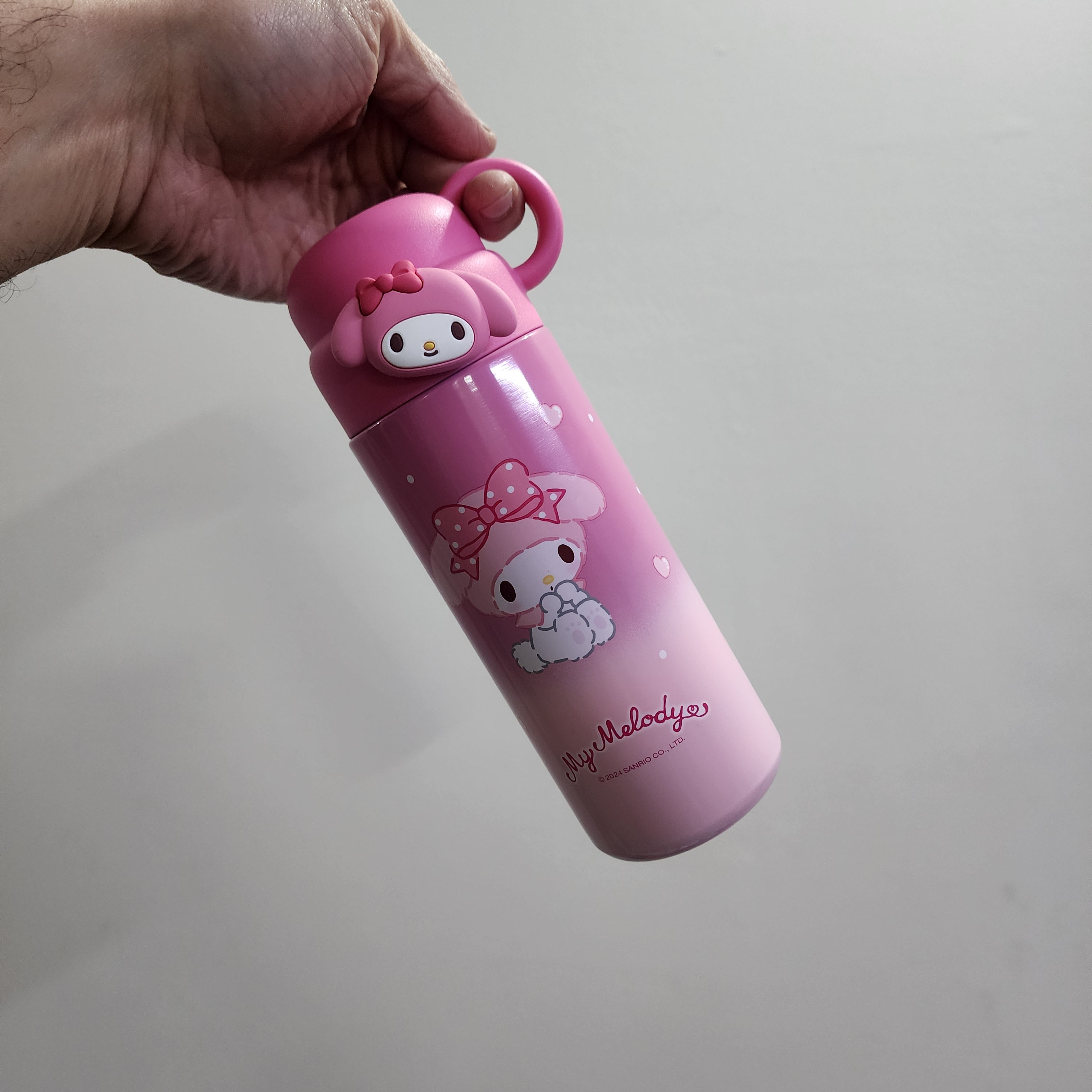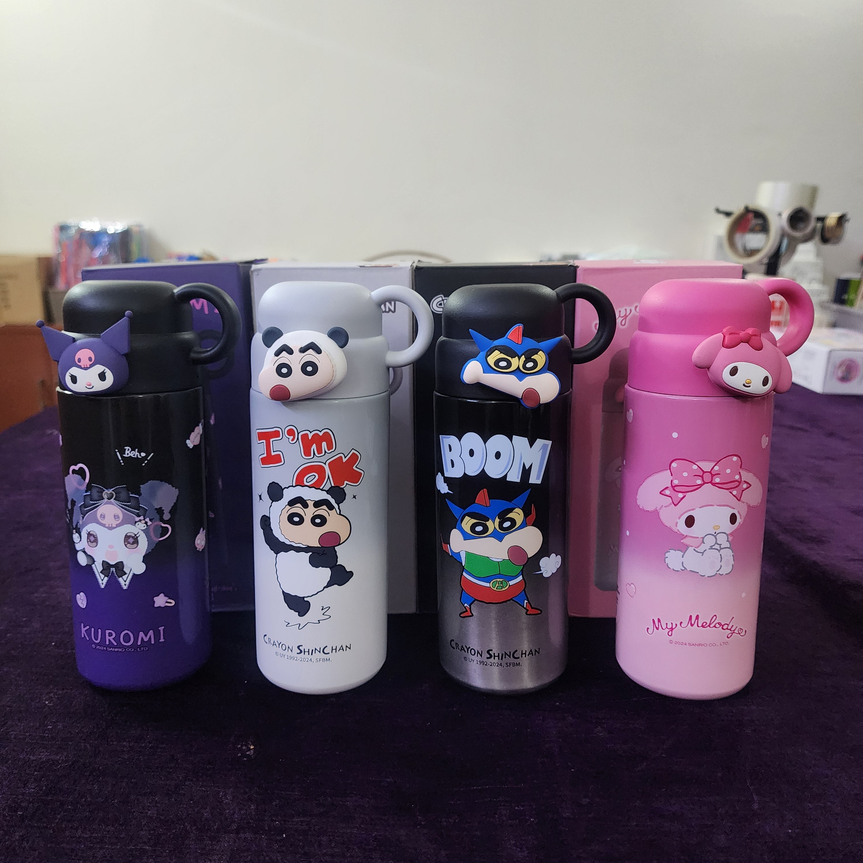 These are insulated stainless steel water bottles featuring characters from the Crayon Shin-chan anime and Sanrio's Kuromi and My Melody.