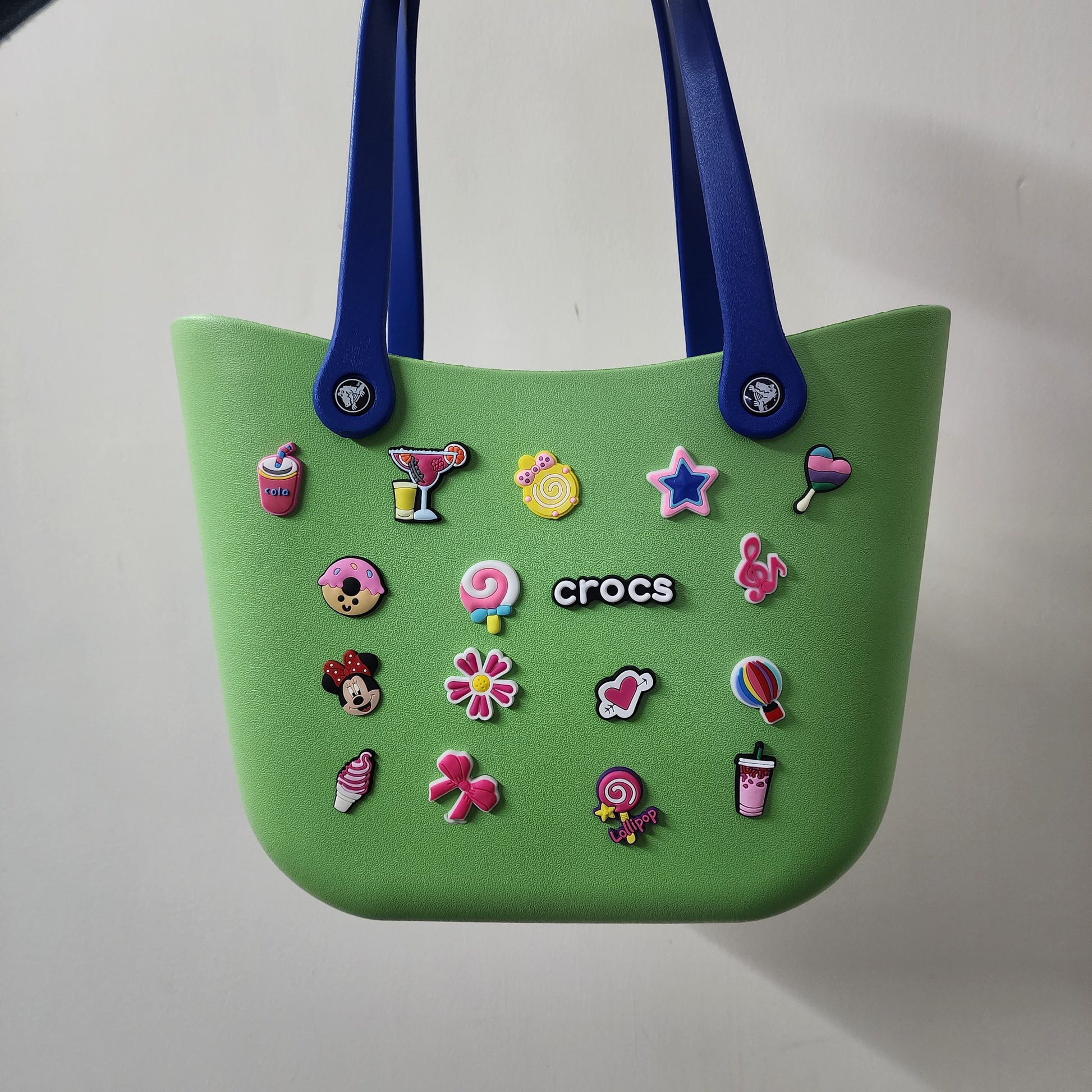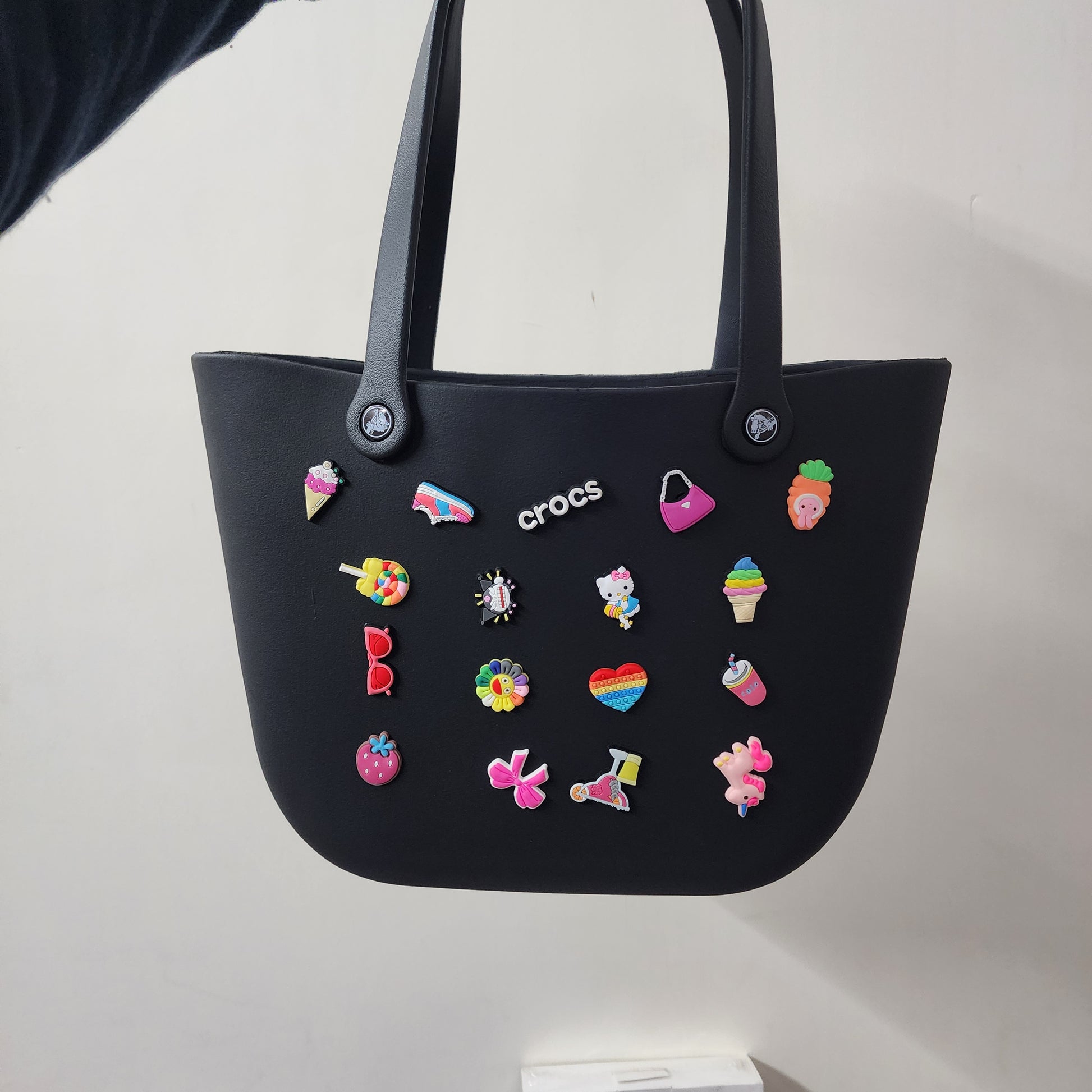 Introducing our multipurpose Crocs Silicon Bag, now with charming [Charms ]! Perfect for storing all your essentials, this bag is durable, waterproof, and stylish. Say goodbye to boring bags and hello to a fun and quirky way to tote your belongings!